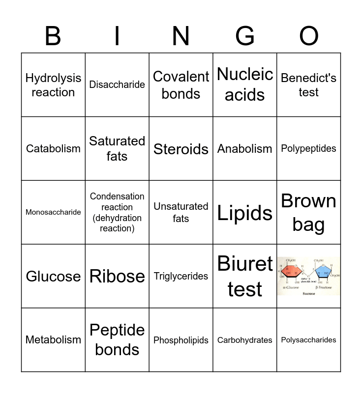 This bingo card has 1 images and 27 words: Amino acid, Anabolism, Carbohydrates, Catabolism, Covalent bonds, Disaccharide, Glucose, Lipids, Metabolism, Monosaccharide, Nucleic acids, Peptide bonds, Phospholipids, Polypeptides, Protein, Ribose, Saturated fats, Steroids, Triglycerides, Hydrolysis reaction, Polysaccharides, Unsaturated fats, Condensation reaction (dehydration reaction), Brown bag, Biuret test, Benedict's test and Iodine test.