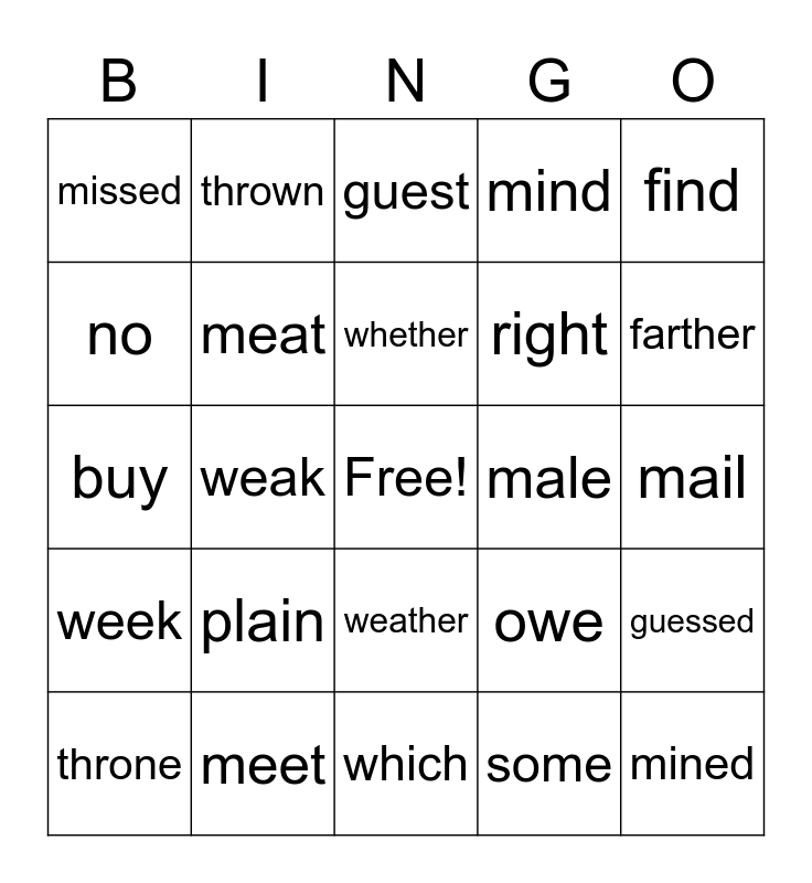 This bingo card has a free space and 41 words: bye, buy, by, meat, meet, weather, whether, fined, find, week, weak, mind, mined, mail, male, plain, plane, missed, mist, guest, guessed, witch, which, right, write, sum, some, father, farther, flower, flour, thrown, throne, oh, owe, no, know, sun, son, banned and band.