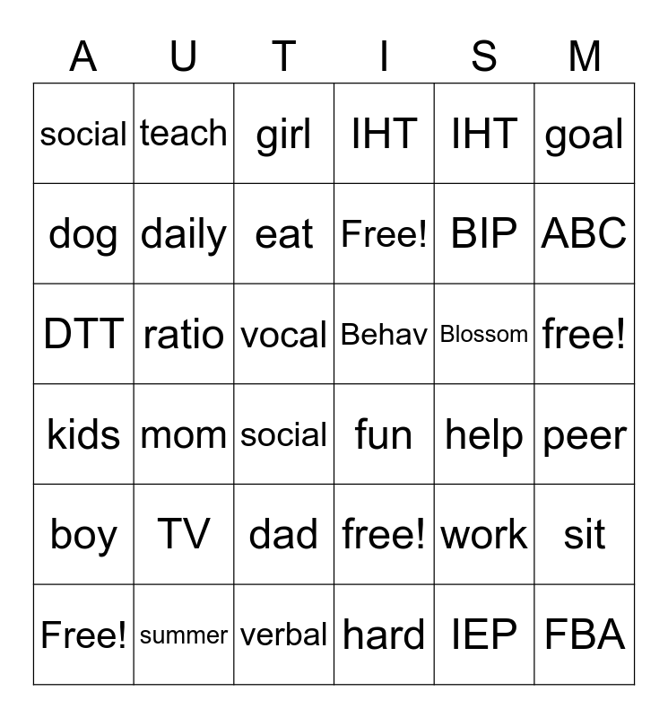 This bingo card has 48 words: boy, ratio, break, IHT, help, FBA, social, objective, girl, fun, BIP, goal, DTT, TV, ASD, Behav, Blossom, free!, Free!, teach, vocal, Free!, IHT, ABC, Beaux, daily, social, play, work, peer, stim, summer, verbal, free!, IEP, PT, kids, mom, dad, hard, easy, sit, dog, cat, eat, snack, teach and cue.