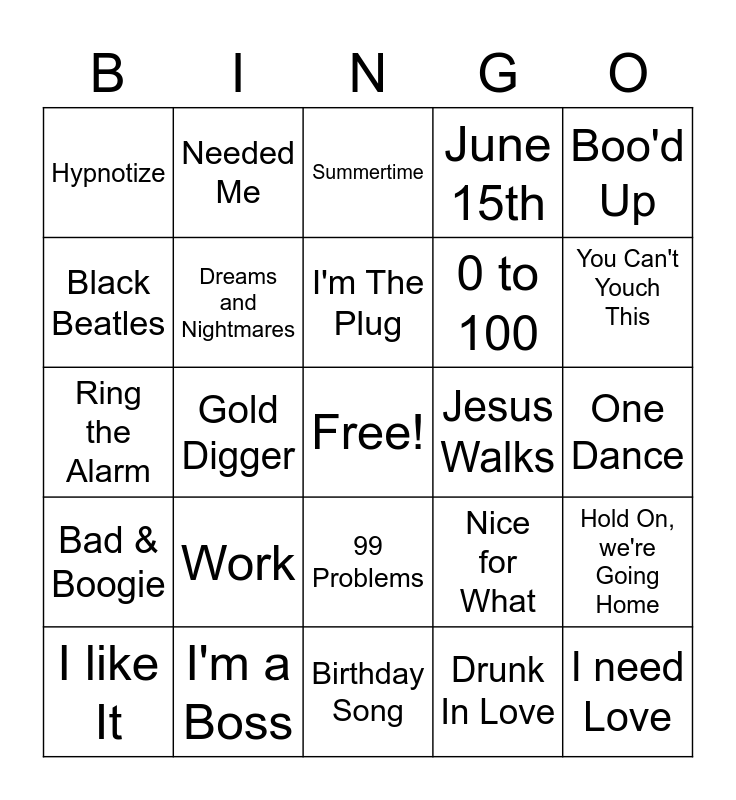 This bingo card has a free space and 24 words: Work, I'm a Boss, I'm The Plug, I like It, Boo'd Up, Hypnotize, Black Beatles, Needed Me, Jesus Walks, 99 Problems, 0 to 100, Ring the Alarm, Nice for What, Hold On, we're Going Home, Dreams and Nightmares, Drunk In Love, One Dance, Summertime, You Can't Youch This, Gold Digger, I need Love, Bad & Boogie, June 15th and Birthday Song.