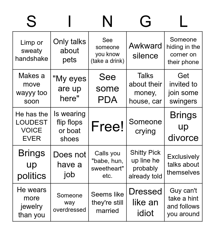This bingo card has a free space and 24 words: Does not have a job, Someone way overdressed, See some PDA, He wears more jewelry than you, Someone hiding in the corner on their phone, Limp or sweaty handshake, Makes a move wayyy too soon, Only talks about pets, Someone crying, Calls you "babe, hun, sweetheart" etc., Talks about their money, house, car, He has the LOUDEST VOICE EVER, Shitty Pick up line he probably already told, Exclusively talks about themselves, "My eyes are up here", Dressed like an idiot, Brings up divorce, See someone you know (take a drink), Get invited to join some swingers, Is wearing flip flops or boat shoes, Guy can't take a hint and follows you around, Brings up politics, Awkward silence and Seems like they're still married.