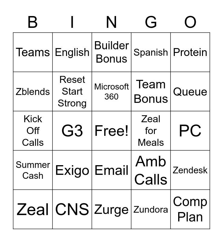 This bingo card has a free space and 29 words: Zeal, Rumba Rusha, G3, VIP, Teams, Builder Bonus, Reset Start Strong, Exigo, Zeal for Meals, CNS, PC, Comp Plan, Zurge, Zundora, Queue, Excel, Email, Summer Cash, Protein, Kick Off Calls, Amb Calls, Backoffice, Team Bonus, Zblends, Spanish, English, Zendesk, Microsoft 360 and Mexigo.