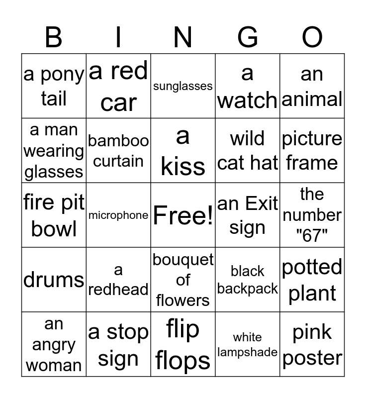 This bingo card has a free space and 24 words: a redhead, a stop sign, a kiss, an angry woman, an animal, a pony tail, a man wearing glasses, a red car, an Exit sign, bouquet of flowers, wild cat hat, fire pit bowl, black backpack, potted plant, bamboo curtain, white lampshade, the number "67", sunglasses, picture frame, microphone, pink poster, drums, a watch and flip flops.