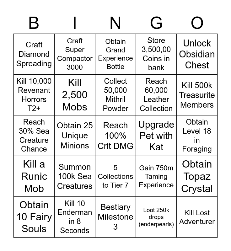 This bingo card has 25 words: Summon 100k Sea Creatures, Bestiary Milestone 3, Collect 50,000 Mithril Powder, Obtain 10 Fairy Souls, Unlock Obsidian Chest, Craft Diamond Spreading, Kill 10,000 Revenant Horrors T2+, Craft Super Compactor 3000, Upgrade Pet with Kat, 5 Collections to Tier 7, Reach 60,000 Leather Collection, Reach 30% Sea Creature Chance, Gain 750m Taming Experience, Obtain Topaz Crystal, Kill 2,500 Mobs, Kill Lost Adventurer, Obtain Level 18 in Foraging, Obtain Grand Experience Bottle, Kill 500k Treasurite Members, Obtain 25 Unique Minions, Reach 100% Crit DMG, Kill 10 Enderman in 8 Seconds, Kill a Runic Mob, Store 3,500,00 Coins in bank and Loot 250k drops (enderpearls).