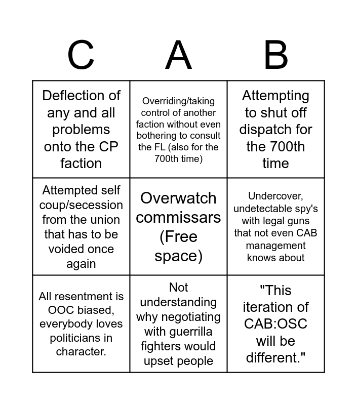 This bingo card has a free space and 8 words: Undercover, undetectable spy's with legal guns that not even CAB management knows about, Attempting to shut off dispatch for the 700th time, Overriding/taking control of another faction without even bothering to consult the FL (also for the 700th time), All resentment is OOC biased, everybody loves politicians in character., Deflection of any and all problems onto the CP faction, "This iteration of CAB:OSC will be different.", Attempted self coup/secession from the union that has to be voided once again and Not understanding why negotiating with guerrilla fighters would upset people.