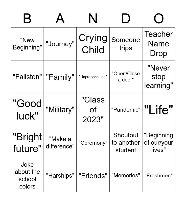 This bingo card has a free space and 62 words: "Covid", "Harships", "We/You did it", "Bright future", "Sacrifice", "Growth", "Family", "Seen, Heard, & Valued", "Open/Close a door", "New Chapter", Someone trips, Someone throws their hands up, "Fallston", "Cougars", "Scholars", "New Beginning", "Freshmen", Teacher Name Drop, Herr Jones, "Unprecedented", "Pandemic", Crying Child, Joke about the school colors, "Memories", "Celebrate", Webster's Dictionary Definition, Famous Quote, "Four years", "Beginning of our/your lives", Joke about HS/College food, Orange Chicken, Parent brought a cowbell, Parents crying, "Welcome", "Life", "Journey", "College", "Career", "Military", Speaker refers to social media, "Good luck", "Wish you the best", "Make a difference", "Be the change", "Never stop learning", Shoutout to another student, "Couldn't have gotten here without", "Diploma", "Prom", "University", "Ceremony", "Friends", Cell phone goes off, "Old", "Grown", "Homework", "Responsibility", "Tests", "Congratulations", "Clubs", "Activities" and "Sports/Athletics".