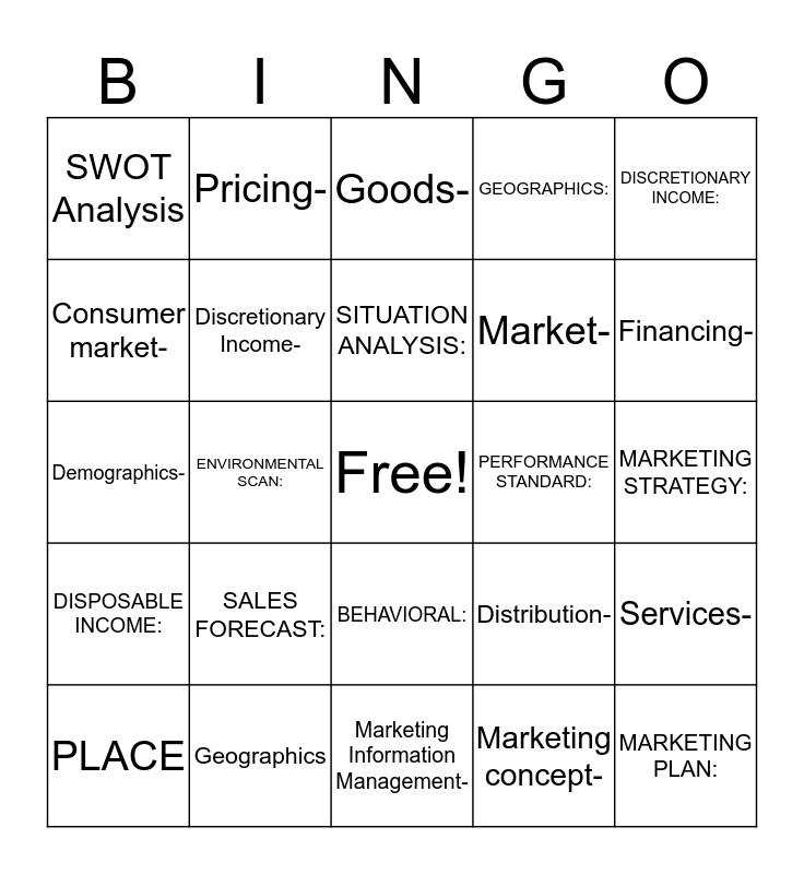This bingo card has a free space and 40 words: Market Segmentation-, Demographics-, Disposable Income-, Discretionary Income-, Geographics, BEHAVIORAL:, SITUATION ANALYSIS:, DEMOGRAPHICS:, DISCRETIONARY INCOME:, DISPOSABLE INCOME:, ENVIRONMENTAL SCAN:, GEOGRAPHICS:, MARKETING PLAN:, MARKETING STRATEGY:, PERFORMANCE STANDARD:, SALES FORECAST:, Psychographics, SWOT Analysis, Utility-, Goods-, Services-, Marketing concept-, Market-, Consumer market-, Industrial market-, Market share-, Target market-, Customer profile-, Marketing mix-, PRICE, PROMOTION, PLACE, PRODUCT, Distribution-, Financing-, Marketing Information Management-, Pricing-, Product/Service Management-, Pricing- and Promotion-.