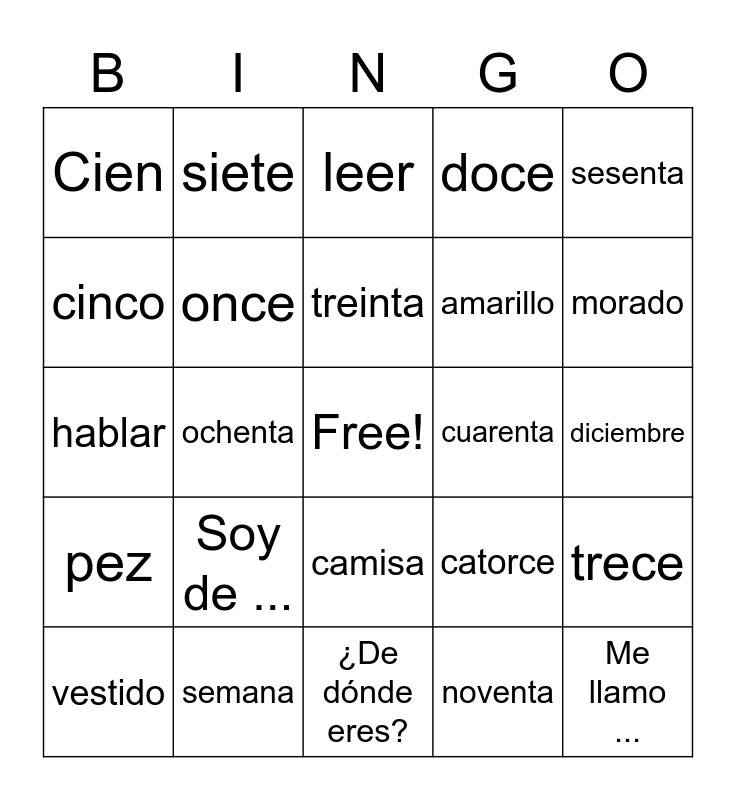 This bingo card has a free space and 49 words: hola, Me llamo ..., ¿Cómo te llamas?, ¿De dónde eres?, Soy de ..., Encantado(a), siete, seis, cinco, diez, once, doce, trece, catorce, quince, veinte, treinta, cuarenta, cincuenta, sesenta, ochenta, noventa, Cien, amarillo, anaranjado, morado, vestido, falda, camisa, pez, pájaro, gato, perro, martes, semana, fecha, enero, marzo, diciembre, miércoles, jueves, viernes, comer, estudiar, hablar, leer, ¿Puedo ir al baño?, Tengo una pregunta. and escuchar.