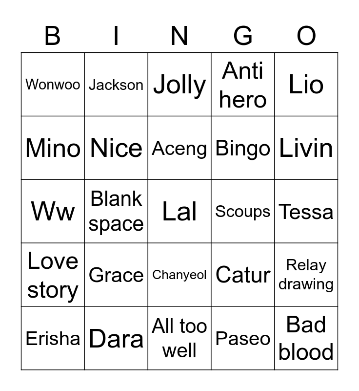 This bingo card has a free space and 24 words: Grace, Dara, Aceng, Erisha, Lio, Wonwoo, Mino, Jackson, Scoups, Chanyeol, Bingo, Ww, Catur, Relay drawing, Nice, Paseo, Tessa, Jolly, Livin, Blank space, Bad blood, Love story, Anti hero and All too well.