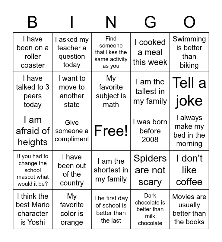 This bingo card has a free space and 24 words: I have been out of the country, My favorite color is orange, My favorite subject is math, I think the best Mario character is Yoshi, Swimming is better than biking, I have been on a roller coaster, I have talked to 3 peers today, I asked my teacher a question today, I was born before 2008, I am the shortest in my family, I am the tallest in my family, I am afraid of heights, Spiders are not scary, I don't like coffee, I want to move to another state, Dark chocolate is better than milk chocolate, I always make my bed in the morning, Find someone that likes the same activity as you, Tell a joke, Give someone a compliment, Movies are usually better than the books, If you had to change the school mascot what would it be?, I cooked a meal this week and The first day of school is better than the last.
