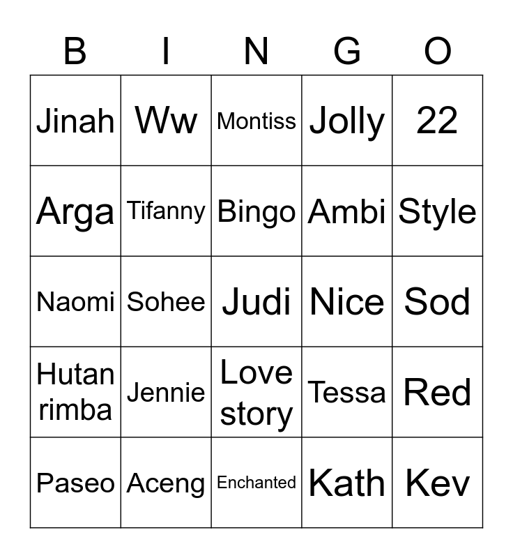 This bingo card has a free space and 24 words: Jennie, Aceng, Bingo, Paseo, 22, Jinah, Arga, Ww, Nice, Love story, Ambi, Naomi, Tessa, Red, Tifanny, Kath, Sod, Montiss, Style, Sohee, Kev, Hutan rimba, Jolly and Enchanted.