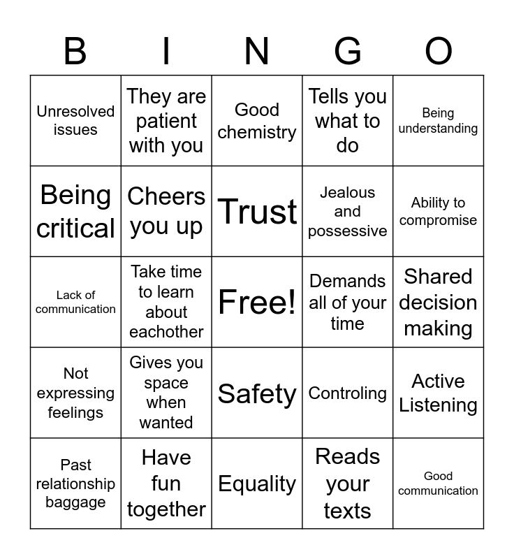 This bingo card has a free space and 39 words: Poor Boundaries, Supportive of your goals and interests, Similar Values, Controling, Active Listening, Not expressing feelings, Take time to learn about eachother, Respect, Demands all of your time, Shared decision making, Being critical, They are patient with you, Self-centered, Ability to compromise, Lack of communication, Gives you space when wanted, Safety, Tells you what to do, Share feelings, Past relationship baggage, Cheers you up, Trust, Reads your texts, Being understanding, Defensiveness, Have fun together, Equality, Calls you names or puts you down, Apologizes when wrong, Unresolved issues, Makes you feel safe, heard, appreciated, Considerate /Understanding, Jealous and possessive, Good communication, Fearing rejection, Respect your boundaries, Good chemistry, Gets physical: hitting, pushing, etc. and Mutual trust.
