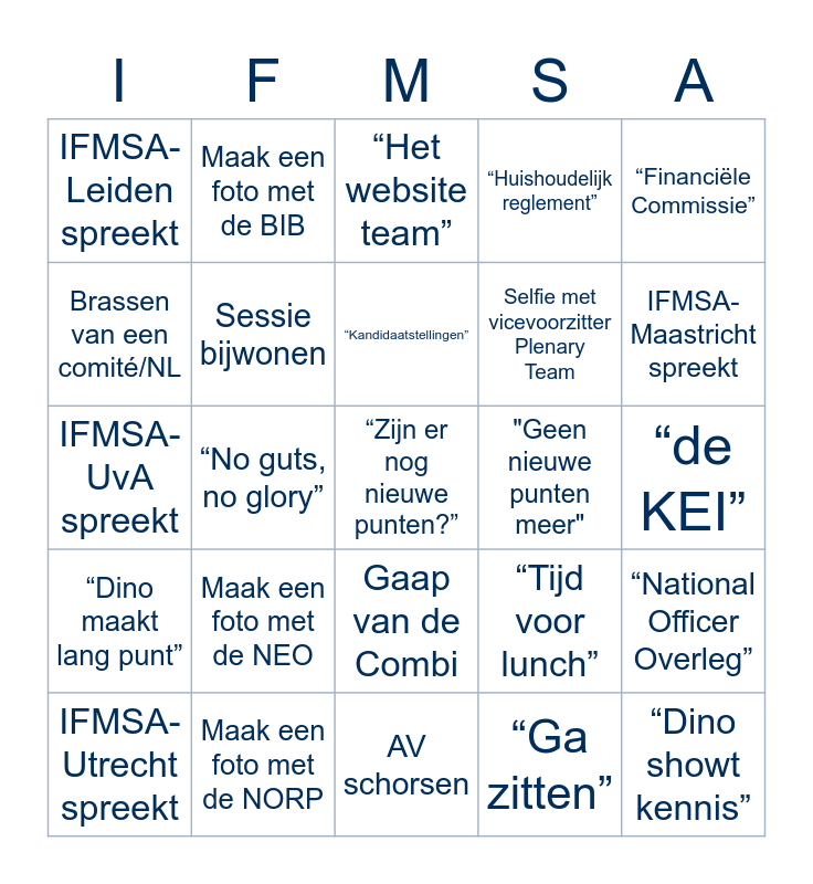 This bingo card has 1 images and 54 words: IFMSA-Utrecht spreekt, IFMSA-Groningen spreekt, IFMSA-Leiden spreekt, AV schorsen, WoCo, Sessie bijwonen, Selfie met voorzitter Plenary Team, Selfie met vicevoorzitter Plenary Team, Kopje koffie/thee pakken, “Huishoudelijk reglement”, “Amendement”, “Direct negatief”, “Alternatieve motie”, "Niet volgen...", “Omwille van de tijd”, “Financiële Commissie”, “No guts, no glory”, “Koffiepauze”, “Zijn er nog nieuwe punten?”, "Geen nieuwe punten meer", “Herhaling”, “Tijd voor lunch”, “Het website team”, “We starten met de roll call”, “Kandidaatstellingen”, “Ga zitten”, RvT praat, “de KEI”, “National Officer Overleg”, “Het bestuur van IFMSA-NL”, “Koffiepauze”, “Agendapunt vervalt”, “Wil er iemand opstaan voor de functie”, Brassen van een comité/NL, IFMSA-UvA spreekt, Iemand herhaalt een gemaakt punt, “Dino maakt lang punt”, “Dino showt kennis”, Raak de banner van IFMSA-NL aan, Maak een foto met de BIB, Maak een foto met de BPRM, Maak een foto met de TC, Maak een foto met de VVI, Maak een foto met de NEO, Maak een foto met de NORP, IFMSA-VU spreekt, IFMSA-Nijmegen spreekt, IFMSA-Rotterdam spreekt, IFMSA-Maastricht spreekt, Hamerslag van PT voor stilte, Klets met Combi-lid, Jazz hands (mee eens), Gaap van de Combi and Gaap van PT.