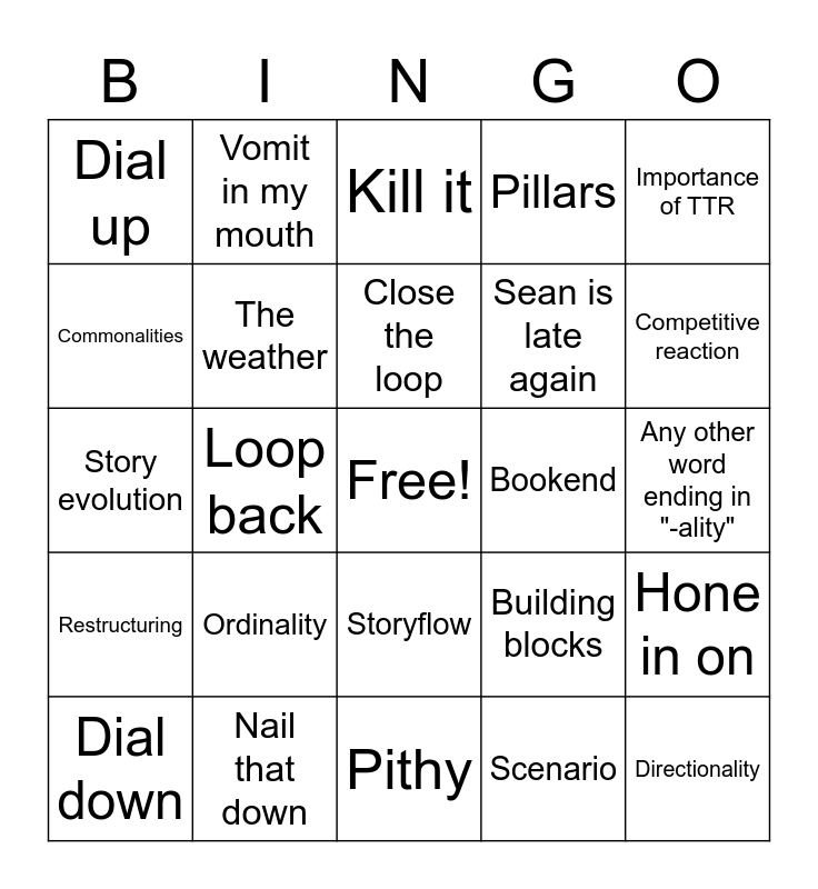 This bingo card has a free space and 24 words: Ordinality, Nail that down, Close the loop, Dial down, Importance of TTR, Dial up, Commonalities, Vomit in my mouth, Bookend, Storyflow, Sean is late again, Story evolution, Building blocks, Hone in on, The weather, Scenario, Any other word ending in "-ality", Kill it, Competitive reaction, Loop back, Directionality, Restructuring, Pillars and Pithy.
