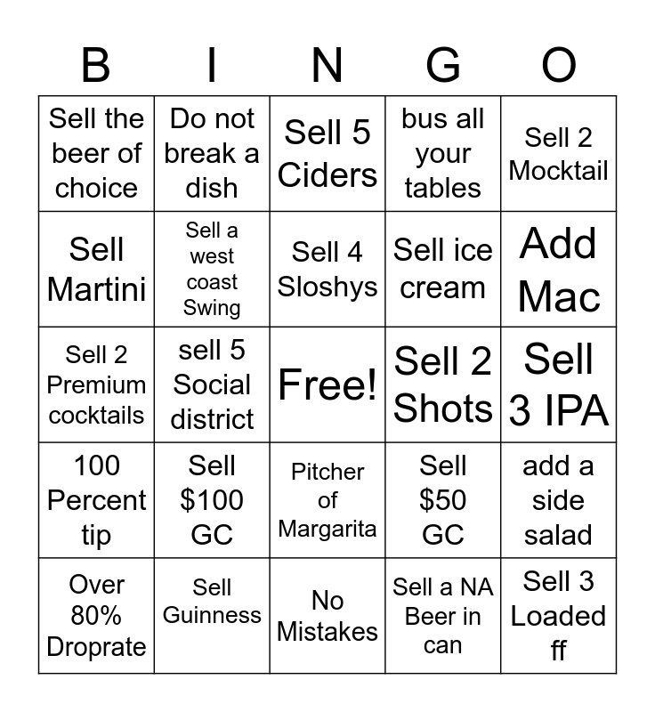 This bingo card has a free space and 24 words: Sell $100 GC, Sell Guinness, Sell 4 Sloshys, Over 80% Droprate, Sell 2 Mocktail, Sell the beer of choice, Sell Martini, Do not break a dish, Sell 2 Shots, Pitcher of Margarita, Sell ice cream, Sell 2 Premium cocktails, Sell $50 GC, add a side salad, Sell a west coast Swing, Sell a NA Beer in can, Sell 3 IPA, Sell 5 Ciders, Add Mac, sell 5 Social district, Sell 3 Loaded ff, 100 Percent tip, bus all your tables and No Mistakes.