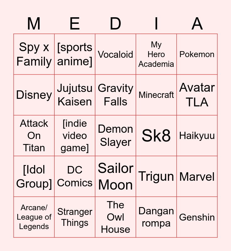 This bingo card has 38 words: Chainsaw Man, Ouran High School, MXTX/ Danmei, Jujutsu Kaisen, Marvel, DC Comics, Gravity Falls, Bungo Stray Dogs, Pokemon, Minecraft, [indie video game], My Hero Academia, Demon Slayer, Haikyuu, Disney, [Idol Group], Studio Ghibli, Vocaloid, Harry Potter, Sk8, Spy x Family, Stranger Things, Avatar TLA, Arcane/ League of Legends, Undertale, The Owl House, Genshin, Overwatch, [online shooter], Sonic, Legend of Zelda, Sailor Moon, Dangan rompa, [sports anime], [gacha game], Trigun, Attack On Titan and Jojo's Bizarre Adventure.