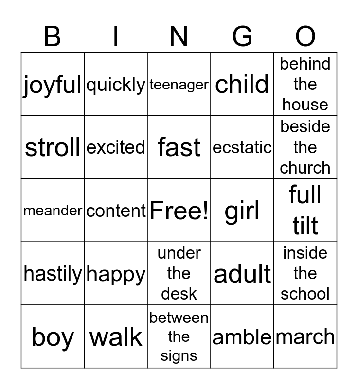 This bingo card has a free space and 24 words: happy, walk, fast, boy, behind the house, joyful, stroll, quickly, girl, under the desk, ecstatic, meander, adult, inside the school, excited, amble, full tilt, teenager, beside the church, content, march, hastily, child and between the signs.