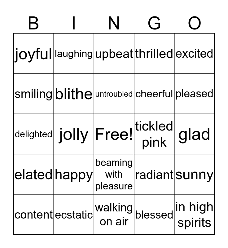 This bingo card has a free space and 24 words: happy, ecstatic, untroubled, content, excited, joyful, smiling, laughing, tickled pink, beaming with pleasure, cheerful, delighted, radiant, sunny, blithe, blessed, glad, upbeat, pleased, jolly, in high spirits, elated, thrilled and walking on air.