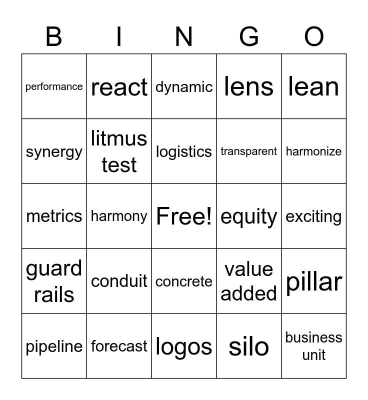 This bingo card has a free space and 42 words: vessel, logistics, fluidity, conduit, silo, pillar, business unit, inclusive, dynamic, concrete, exciting, harmonize, harmony, lean, Project Pheonix, value added, leadership, metrics, big picture, react, synergy, energize, investment, performance, shifted, supply chain, transparent, benchmark, isolation, acquisitions, rules of engagement, guard rails, litmus test, logos, centralized, pipeline, forecast, equity, transformation, focus, lens and optics.