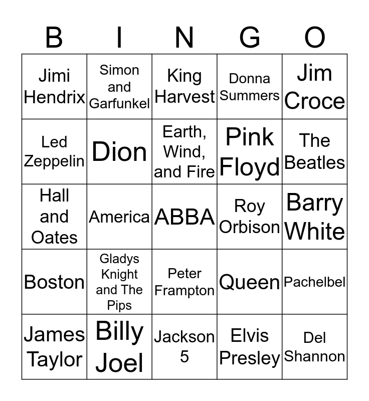 This bingo card has 25 words: Gladys Knight and The Pips, Jackson 5, Earth, Wind, and Fire, James Taylor, Jim Croce, Jimi Hendrix, Led Zeppelin, Simon and Garfunkel, Roy Orbison, Peter Frampton, Pink Floyd, Hall and Oates, Queen, Pachelbel, Dion, Del Shannon, Barry White, King Harvest, The Beatles, America, ABBA, Billy Joel, Boston, Donna Summers and Elvis Presley.
