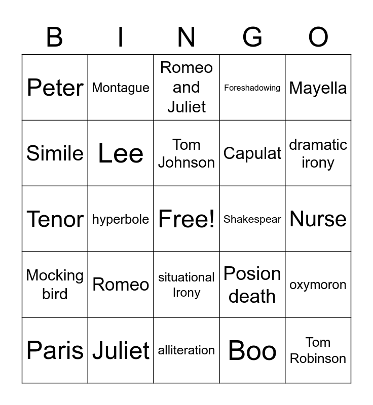 This bingo card has a free space and 24 words: Romeo, Juliet, Tom Johnson, Paris, Mayella, Peter, Simile, Montague, Shakespear, situational Irony, Capulat, Tenor, Posion death, oxymoron, Lee, Boo, Nurse, Romeo and Juliet, dramatic irony, hyperbole, Tom Robinson, Mocking bird, Foreshadowing and alliteration.