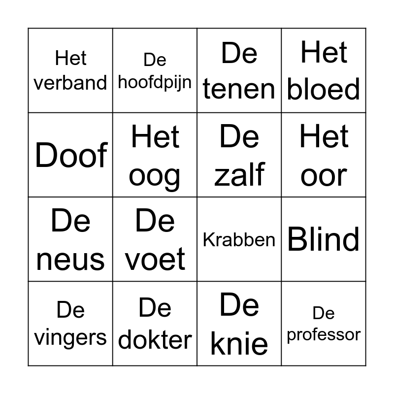 This bingo card has 16 words: De dokter, Blind, De tenen, Het verband, De neus, De hoofdpijn, Krabben, De knie, Doof, Het oog, De vingers, Het bloed, De voet, Het oor, De zalf and De professor.
