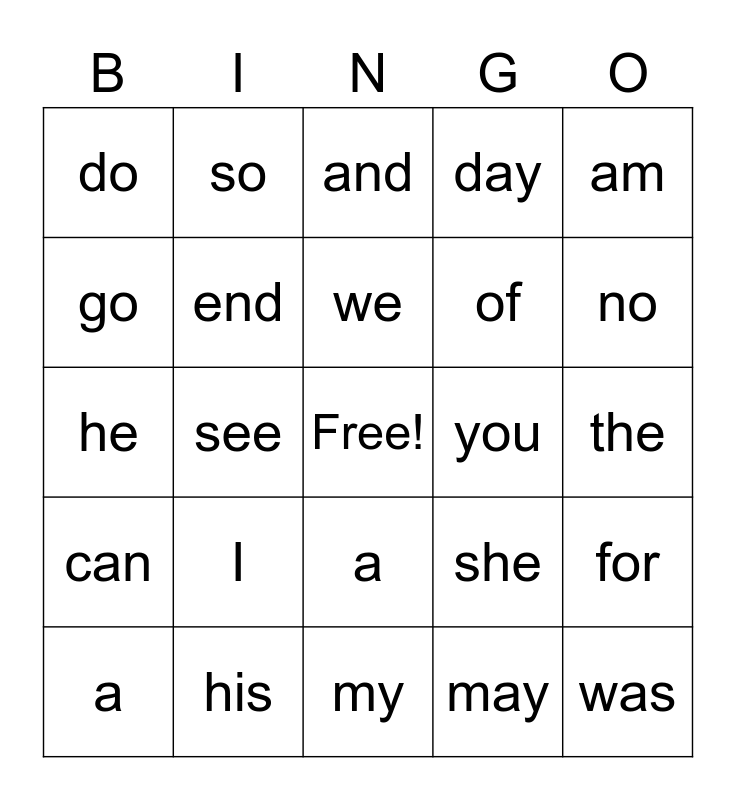 This bingo card has a free space and 25 words: I, my, we, a, am, do, go, so, you, a, of, he, she, for, end, is, the, and, no, see, was, his, can, day and may.