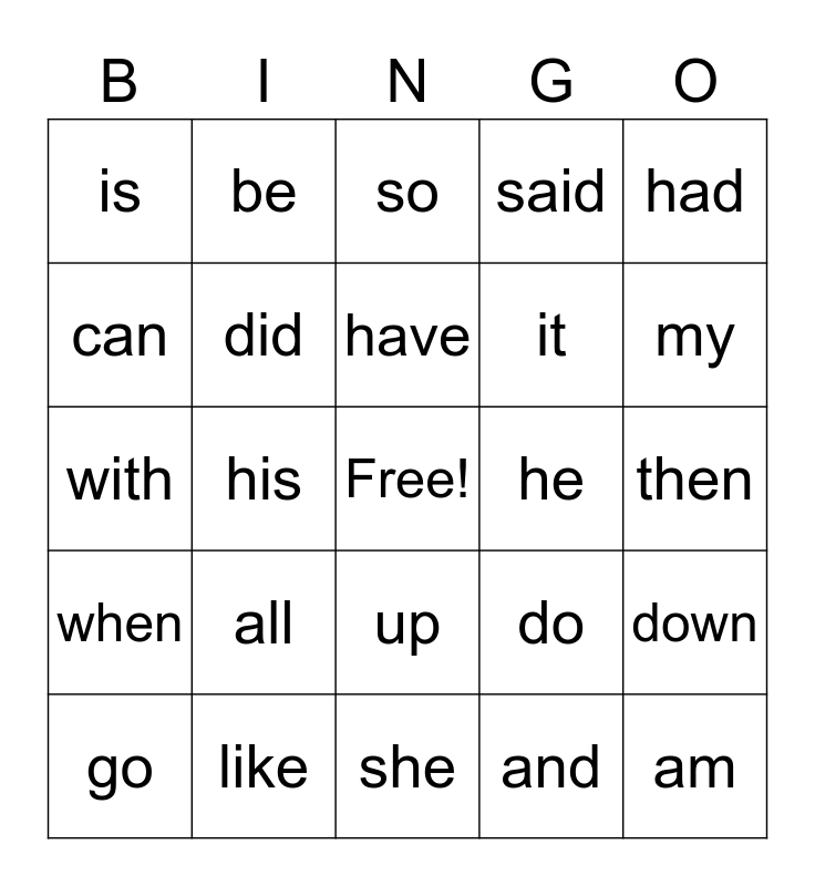 This bingo card has a free space and 53 words: a, am, at, and, all, as, be, but, can, come, did, dad, down, do, for, go, have, he, him, had, his, I, it, is, in, like, look, love, little, my, me, mom, not, on, out, see, said, she, so, the, to, that, then, they, there, up, we, will, with, when, what, were and you.