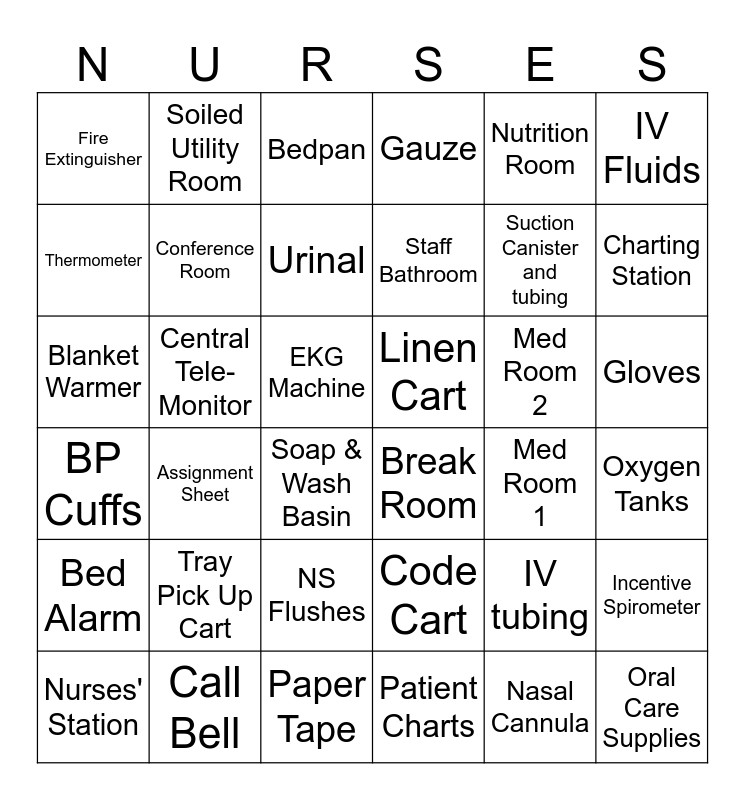 This bingo card has 36 words: Code Cart, NS Flushes, Patient Charts, Thermometer, BP Cuffs, Linen Cart, Conference Room, Paper Tape, Nutrition Room, IV tubing, Charting Station, Gauze, Incentive Spirometer, Central Tele- Monitor, Staff Bathroom, Fire Extinguisher, Bed Alarm, Med Room 2, Blanket Warmer, Bedpan, EKG Machine, Assignment Sheet, Break Room, Soap & Wash Basin, Med Room 1, Soiled Utility Room, Suction Canister and tubing, Call Bell, Urinal, IV Fluids, Oral Care Supplies, Nurses' Station, Oxygen Tanks, Gloves, Tray Pick Up Cart and Nasal Cannula.