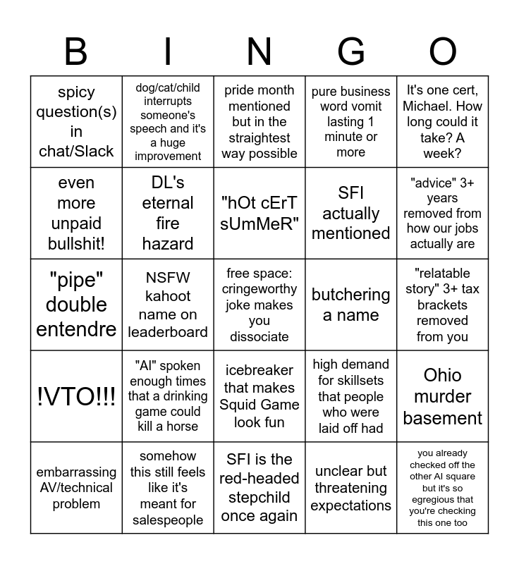 This bingo card has a free space and 24 words: "AI" spoken enough times that a drinking game could kill a horse, somehow this still feels like it's meant for salespeople, "hOt cErT sUmMeR", embarrassing AV/technical problem, It's one cert, Michael. How long could it take? A week?, spicy question(s) in chat/Slack, even more unpaid bullshit!, dog/cat/child interrupts someone's speech and it's a huge improvement, butchering a name, icebreaker that makes Squid Game look fun, SFI actually mentioned, "pipe" double entendre, high demand for skillsets that people who were laid off had, Ohio murder basement, DL's eternal fire hazard, unclear but threatening expectations, "relatable story" 3+ tax brackets removed from you, pride month mentioned but in the straightest way possible, "advice" 3+ years removed from how our jobs actually are, NSFW kahoot name on leaderboard, you already checked off the other AI square but it's so egregious that you're checking this one too, !VTO!!!, pure business word vomit lasting 1 minute or more and SFI is the red-headed stepchild once again.