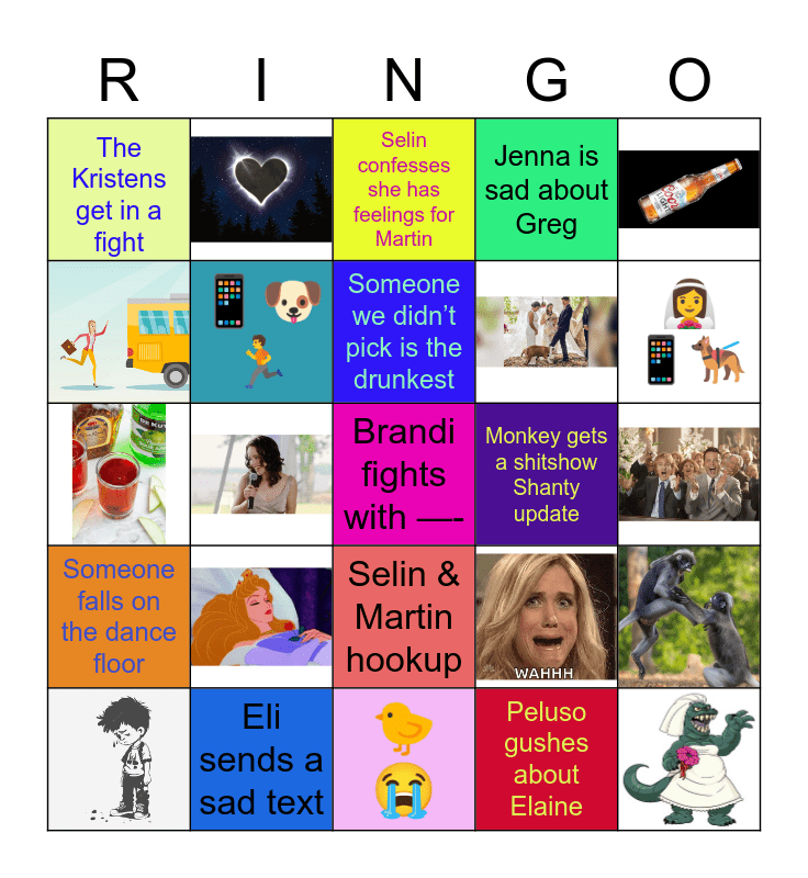 This bingo card has 12 images, a free space and 12 words: Eli sends a sad text, Someone we didnβt pick is the drunkest, The Kristens get in a fight, Monkey gets a shitshow Shanty update, Selin & Martin hookup, π±πΆπ, Peluso gushes about Elaine, Selin confesses she has feelings for Martin, π°ββοΈπ±πβπ¦Ί, Someone falls on the dance floor, Jenna is sad about Greg and π€π.