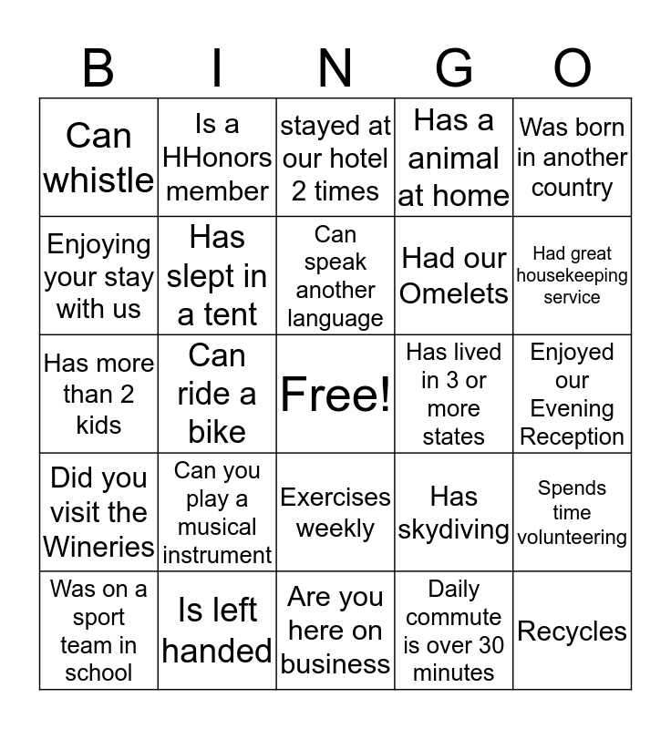 This bingo card has a free space and 24 words: Can you play a musical instrument, Is left handed, Can speak another language, Was on a sport team in school, Was born in another country, Can whistle, Enjoying your stay with us, Is a HHonors member, Has lived in 3 or more states, Exercises weekly, Had our Omelets, Has more than 2 kids, Has skydiving, Spends time volunteering, Has slept in a tent, Daily commute is over 30 minutes, Enjoyed our Evening Reception, stayed at our hotel 2 times, Had great housekeeping service, Can ride a bike, Recycles, Did you visit the Wineries, Has a animal at home and Are you here on business.