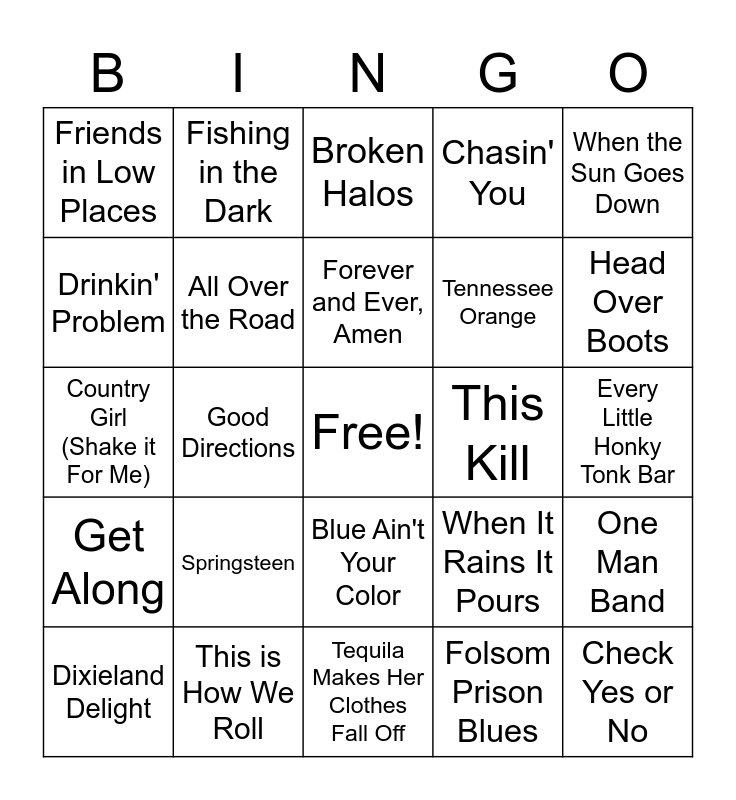This bingo card has a free space and 29 words: Dixieland Delight, Chattahoochee, Good Directions, In Case You Didn't Know, Friends in Low Places, Broken Halos, All Over the Road, Springsteen, This Kill, This is How We Roll, Every Little Honky Tonk Bar, Check Yes or No, Tequila Makes Her Clothes Fall Off, Folsom Prison Blues, Head Over Boots, Your Man, Blue Ain't Your Color, Get Along, When the Sun Goes Down, Country Girl (Shake it For Me), When It Rains It Pours, She Got the Best of Me, Tennessee Orange, Drinkin' Problem, Chasin' You, Fishing in the Dark, One Man Band, Forever and Ever, Amen and Deeper Than the Holler.