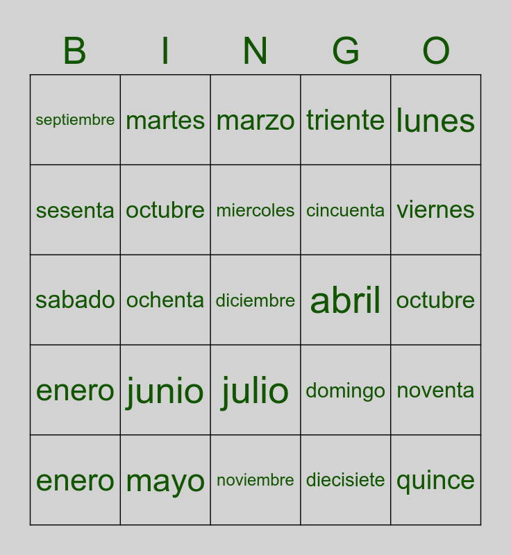 This bingo card has 34 words: quince, diecisiete, catorce, cien, enero, octubre, lunes, enero, martes, febrero, miercoles, marzo, ¡gratis!, jueves, abril, viernes, mayo, sabado, junio, domingo, julio, agosto, septiembre, octubre, noviembre, diciembre, triente, cuarenta, cincuenta, sesenta, setenta, ochenta, noventa and cien.