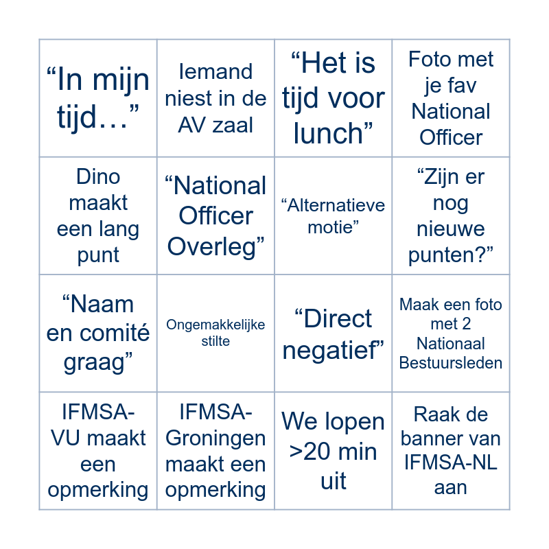 This bingo card has 40 words: “Amendement”, “Direct negatief”, “Is er iemand die wil opstaan voor deze functie?”, “Alternatieve motie”, “Omwille van de tijd”, De RvT doet een uitspraak, “Zijn er nog nieuwe punten?”, Keiharde hamerslag van PT voor stilte, Dino maakt een lang punt, Raak de banner van IFMSA-NL aan, Maak een foto met 2 Nationaal Bestuursleden, Foto met je fav National Officer, IFMSA-VU maakt een opmerking, We lopen >20 min uit, IFMSA-Groningen maakt een opmerking, IFMSA-Maastricht maakt een opmerking, De AV wordt geschorst, “In mijn tijd…”, “Herhaling”, “Het is tijd voor lunch”, “Ga zitten!”, PT verspreekt zich, “Naam en comité graag”, “National Officer Overleg”, Iemand rent hard voor het microfoon geven, Iemand loopt tijdens de AV de zaal binnen, Iemand brengt een snack naar de Combi of PT, Geef een compliment aan iemand van een ander comité, “Wil het bestuur hierop reageren?”, “Agendapunt vervalt”, “Wil er iemand opstaan voor de functie”, Er is gebrast van een comité, Er is gebrast van IFMSA-NL, Iemand herhaalt iets wat al is genoemd, Ongemakkelijke stilte, Jazz hands door vrijwilligers, Gaap van de Combi, Gaap van PT, Iemand niest in de AV zaal and Iemand zegt iets zonder naam en comité te noemen.