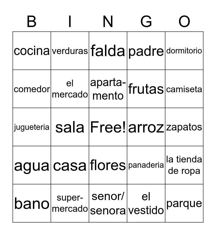 This bingo card has a free space and 24 words: casa, super-mercado, aparta- mento, bano, dormitorio, cocina, comedor, verduras, arroz, flores, frutas, jugueteria, panaderia, la tienda de ropa, el mercado, el vestido, zapatos, falda, camiseta, sala, parque, agua, padre and senor/ senora.