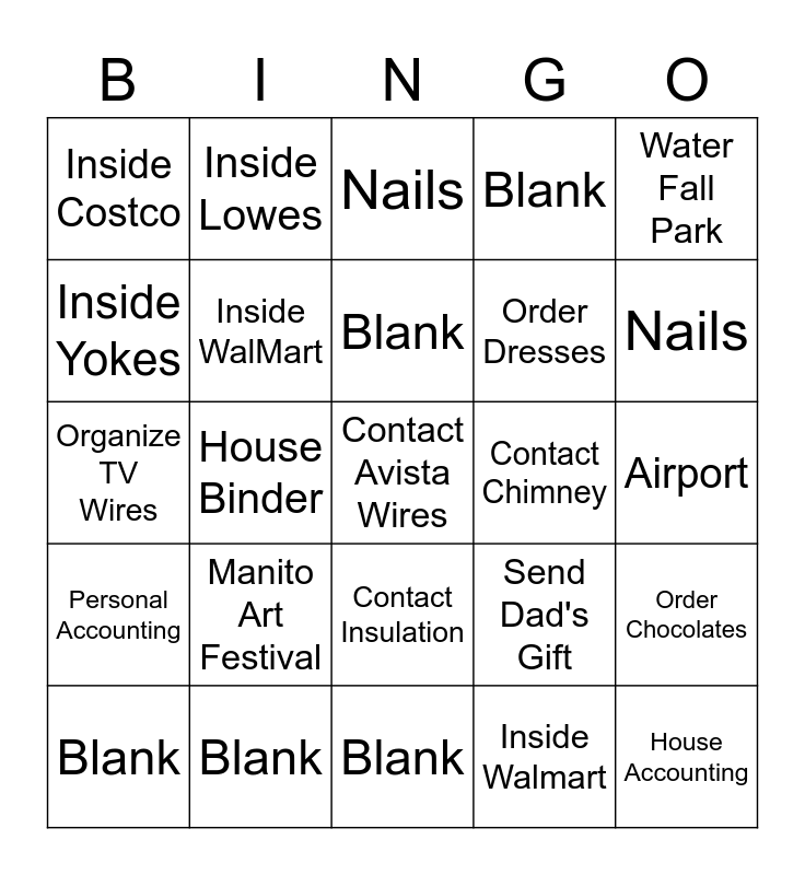 This bingo card has a free space and 24 words: Manito Art Festival, Blank, Blank, Blank, Water Fall Park, Inside Costco, Inside Yokes, Inside Lowes, Contact Chimney, Contact Insulation, Order Dresses, Organize TV Wires, Send Dad's Gift, Order Chocolates, Inside WalMart, Inside Walmart, Airport, Nails, Nails, House Binder, House Accounting, Personal Accounting, Blank and Blank.