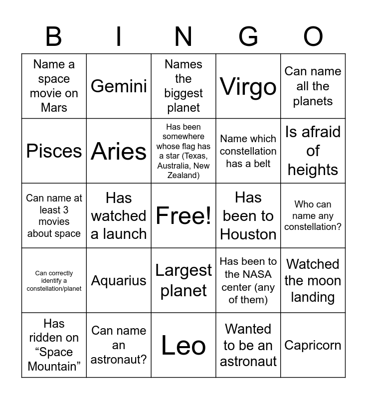 This bingo card has a free space and 50 words: Taurus, Capricorn, Libra, Leo, Aquarius, Scorpio, Gemini, Cancer, Pisces, Sagittarius, Aries, Virgo, Watched the moon landing, Has been to the NASA center (any of them), Name the space movie Tom Hanks was in, Knows the name of north star, Has been somewhere whose flag has a star (Texas, Australia, New Zealand), Has been to Houston, Has wished on a shooting star, Can name all the planets, Has watched a launch, Wanted to be an astronaut, Name a space movie on Mars, Name which constellation has a belt, Name which constellation has a big and little version, Has been to the air and space museum, Is afraid of heights, Knows which plant is the lightest, Names the biggest planet, Largest planet, Smallest planet, Brightest planet, Has the most moons, Planet with Rings, Can name an astronaut?, Has flown in an airplane?, Who knows what the name of our galaxy is?, Who was the first astronaut to step foot on the moon?, Who knows what planet is closest to the sun?, Who can name any constellation?, Who thinks Pluto should still be a planet?, Who has ever see a comet?,, Can moonwalk,, Has seen the northern lights,, Has ridden on “Space Mountain”, Can name at least 3 movies about space, Has been to a planetarium show,, Ever put glow in the dark decals/stickers in their house, Can correctly identify a constellation/planet and Has watched an alien-themed movie.
