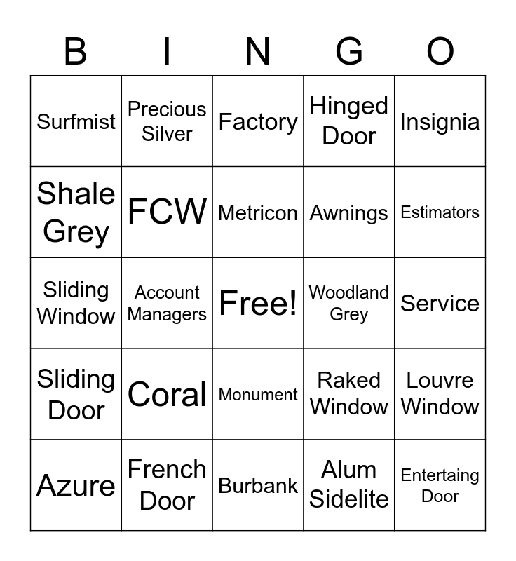 This bingo card has a free space and 25 words: Coral, Burbank, Metricon, Azure, Insignia, Surfmist, Shale Grey, Precious Silver, Woodland Grey, Monument, Awnings, Sliding Window, Raked Window, Louvre Window, FCW, Transport, Service, Factory, Estimators, Account Managers, Entertaing Door, French Door, Sliding Door, Hinged Door and Alum Sidelite.