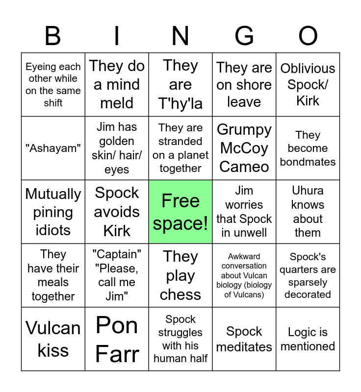 This bingo card has a free space and 24 words: "Captain" "Please, call me Jim", Pon Farr, They are stranded on a planet together, Vulcan kiss, Oblivious Spock/ Kirk, Eyeing each other while on the same shift, "Ashayam", They do a mind meld, Jim worries that Spock in unwell, They play chess, Grumpy McCoy Cameo, Mutually pining idiots, Awkward conversation about Vulcan biology (biology of Vulcans), Spock's quarters are sparsely decorated, Jim has golden skin/ hair/ eyes, Spock meditates, Uhura knows about them, They are T'hy'la, They become bondmates, Spock avoids Kirk, Logic is mentioned, They have their meals together, They are on shore leave and Spock struggles with his human half.