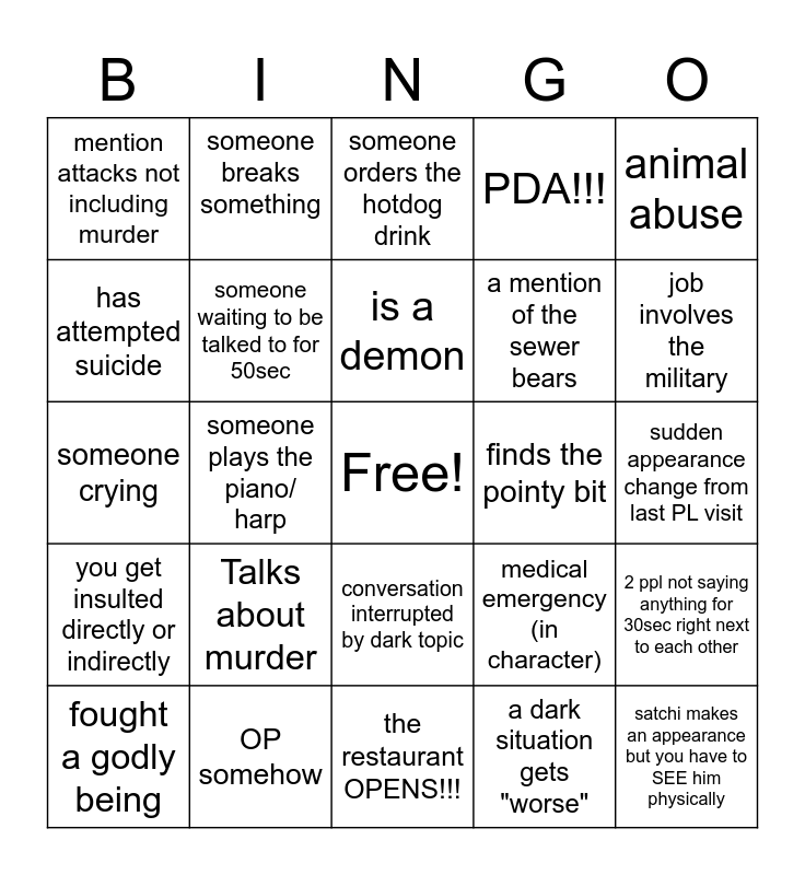 This bingo card has a free space and 24 words: Talks about murder, OP somehow, is a demon, fought a godly being, animal abuse, mention attacks not including murder, has attempted suicide, someone breaks something, finds the pointy bit, conversation interrupted by dark topic, a mention of the sewer bears, someone crying, medical emergency (in character), 2 ppl not saying anything for 30sec right next to each other, someone waiting to be talked to for 50sec, a dark situation gets "worse", sudden appearance change from last PL visit, someone orders the hotdog drink, job involves the military, someone plays the piano/ harp, satchi makes an appearance but you have to SEE him physically, you get insulted directly or indirectly, PDA!!! and the restaurant OPENS!!!.