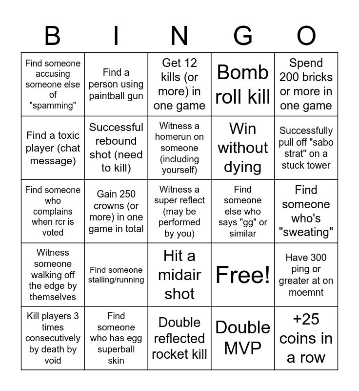 This bingo card has 27 words: Free!, +25 coins in a row, Win without dying, Double reflected rocket kill, Find a toxic player (chat message), Get 12 kills (or more) in one game, Find a person using paintball gun, Witness someone walking off the edge by themselves, Find someone else who says "gg" or similar, Have 300 ping or greater at on moemnt, Find someone who complains when rcr is voted, Bomb roll kill, Kill players 3 times consecutively by death by void, Find someone who has egg superball skin, Successfully pull off "sabo strat" on a stuck tower, Gain 300 bricks (or more) in one game, Successful rebound shot (need to kill), Witness a homerun on someone (including yourself), Find someone stalling/running, Find someone accusing someone else of "spamming", Find someone who's "sweating", Double MVP, Gain 250 crowns (or more) in one game in total, Witness a super reflect (may be performed by you), Hit a midair shot, Spend 200 bricks or more in one game and Win a game without lunging, bomb launching, or rocket launching.
