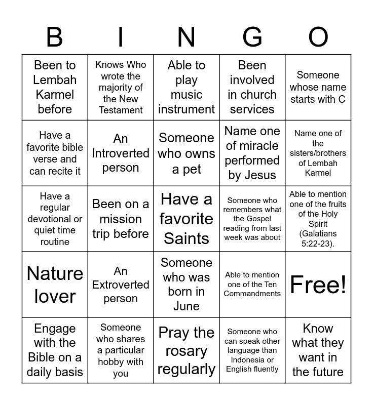 This bingo card has 26 words: Someone who was born in June, Someone who can speak other language than Indonesia or English fluently, Someone who owns a pet, Someone who shares a particular hobby with you, Someone whose name starts with C, Been to Lembah Karmel before, Have a favorite bible verse and can recite it, Knows Who wrote the majority of the New Testament, Able to mention one of the fruits of the Holy Spirit (Galatians 5:22-23)., Able to mention one of the Ten Commandments, Name one of miracle performed by Jesus, Have a regular devotional or quiet time routine, Free!, Engage with the Bible on a daily basis, Been on a mission trip before, Have a favorite Christian podcast or YouTube channel that they follow, Been involved in church services, Nature lover, Able to play music instrument, Have a favorite Saints, Name one of the sisters/brothers of Lembah Karmel, Pray the rosary regularly, Someone who remembers what the Gospel reading from last week was about, An Extroverted person, An Introverted person and Know what they want in the future.