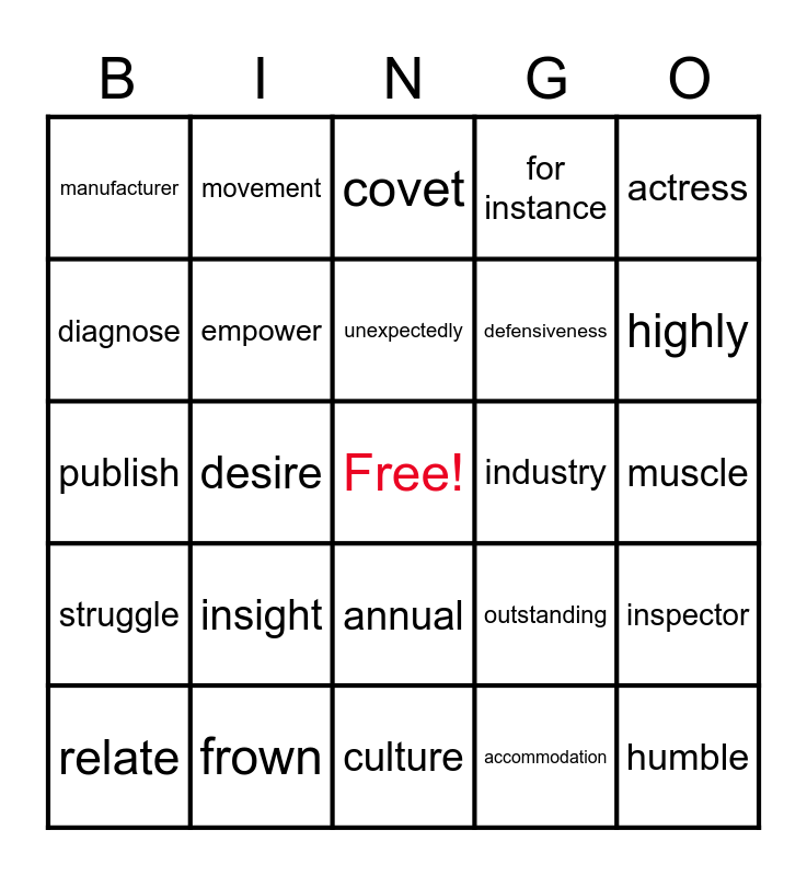 This bingo card has a free space and 100 words: express, posture, muscle, upward, narrow, oddly, betray, forehead, eyebrow, surrounding, analyze, trigger, response, frown, escape, indicator, defensiveness, potential, arrogant, basically, recognize, likewise, reveal, honesty, award, industry, actress, outstanding, achievement, strive, desire, manufacturer, advertise, motorist, accommodation, unexpectedly, inspector, review, throughout, anonymously, detour, journey, publish, annually, highly, covet, handful, gourmet, international, culture, proper, include, various, location, squeeze, certainly, route, budget, leisure, for instance, lodge, shorten, lengthen, estimate, accurately, arrangement, necessary, organize, destination, transportation, intimate, insight, require, research, climate, emergency, intimidate, diagnose, cancer, tragic, pass away, humble, continue, annual, inspire, movement, foundation, charity, individual, struggle, treatment, awareness, educate, relate, empower, encourage, contribute, patient, spirit and visa law.