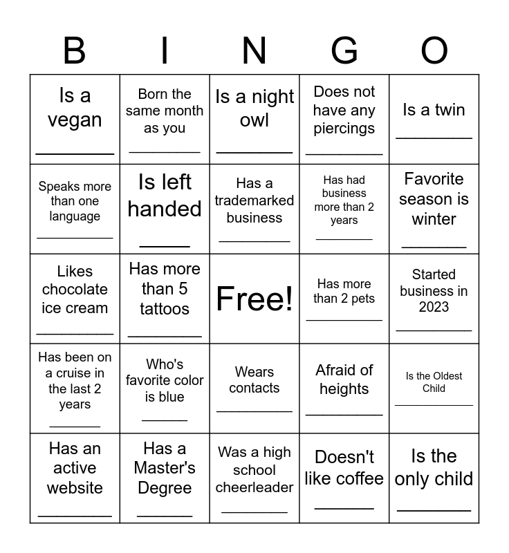 This bingo card has a free space and 24 words: Who's favorite color is blue ______, Has a Master's Degree ______, Has a trademarked business _________, Has an active website ________, Is a twin ________, Is a vegan _______, Speaks more than one language ___________, Born the same month as you _________, Has more than 2 pets ___________, Wears contacts __________, Has had business more than 2 years _________, Likes chocolate ice cream _________, Afraid of heights _________, Is the Oldest Child ______________, Is left handed ____, Doesn't like coffee ______, Started business in 2023 __________, Is a night owl _______, Favorite season is winter _______, Has more than 5 tattoos ________, Is the only child _______, Has been on a cruise in the last 2 years _______, Does not have any piercings _________ and Was a high school cheerleader ________.
