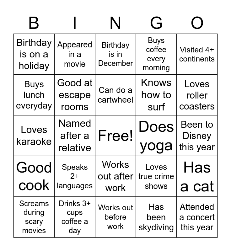 This bingo card has a free space and 24 words: Speaks 2+ languages, Drinks 3+ cups coffee a day, Can do a cartwheel, Screams during scary movies, Visited 4+ continents, Birthday is on a holiday, Buys lunch everyday, Appeared in a movie, Does yoga, Works out after work, Knows how to surf, Loves karaoke, Loves true crime shows, Has a cat, Good at escape rooms, Has been skydiving, Been to Disney this year, Birthday is in December, Loves roller coasters, Named after a relative, Attended a concert this year, Good cook, Buys coffee every morning and Works out before work.