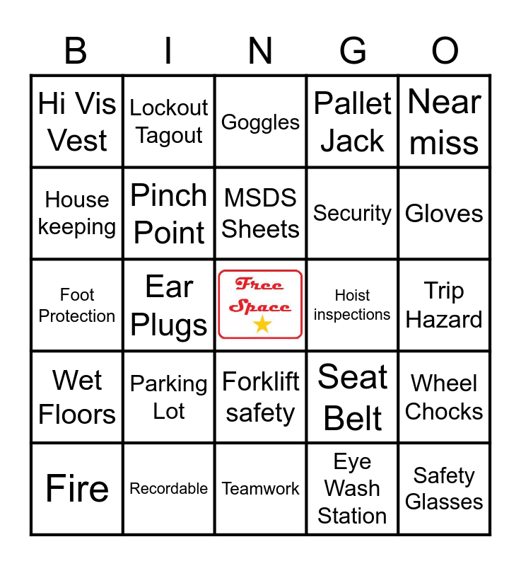 This bingo card has a free space and 29 words: Fire, First Aid, Ear Plugs, safety walk, Hi Vis Vest, Goggles, Pinch Point, Parking Lot, Hoist inspections, Recordable, Trip Hazard, Safety Glasses, Teamwork, Eye Wash Station, Gloves, Safety Guards, Forklift safety, Wet Floors, Near miss, Foot Protection, Seat Belt, Kevlar, Security, House keeping, Pallet Jack, Lockout Tagout, Wheel Chocks, MSDS Sheets and Tripping Hazards.