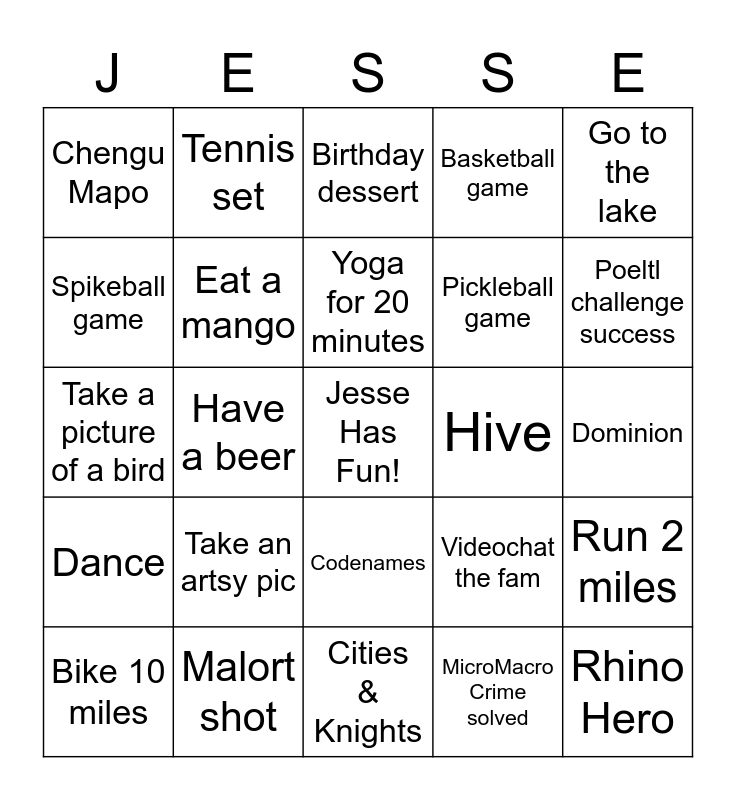 This bingo card has a free space and 30 words: Malort shot, Glass of wine, Have a beer, Spiked seltzer, Chengu Mapo, Birthday dessert, Eat a mango, Codenames, Hive, Cities & Knights, Dominion, Rhino Hero, MicroMacro Crime solved, Set puzzle, Poeltl challenge success, Pet a dog, Videochat the fam, Dance, Take an artsy pic, Go to the lake, Take a picture of a bird, Enjoy sunrise or sunset, Tennis set, Pickleball game, Spikeball game, Basketball game, Run 2 miles, Bike 10 miles, Yoga for 20 minutes and 300 pushups.