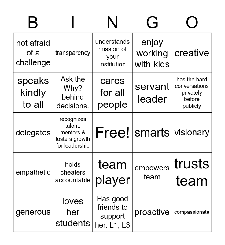 This bingo card has a free space and 24 words: holds cheaters accountable, loves her students, cares for all people, generous, creative, not afraid of a challenge, speaks kindly to all, transparency, smarts, team player, servant leader, delegates, empowers team, trusts team, Ask the Why? behind decisions., proactive, visionary, understands mission of your institution, has the hard conversations privately before publicly, recognizes talent: mentors & fosters growth for leadership, compassionate, empathetic, enjoy working with kids and Has good friends to support her: L1, L3.