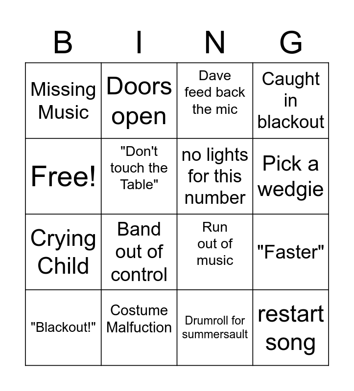 This bingo card has 16 words: Costume Malfuction, "Faster", Dave feed back the mic, Missing Music, Crying Child, Doors open, Run out of music, Drumroll for summersault, Free!, "Don't touch the Table", "Blackout!", Caught in blackout, Band out of control, Pick a wedgie, no lights for this number and restart song.